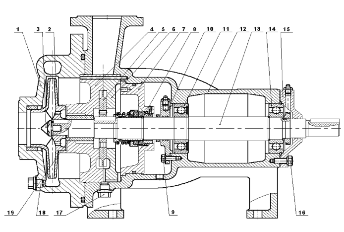 1 — Крышка; 2 — Центробежное колесо; 4- -Вставка; 5- Вихревое колесо; 6 — Вставка; 8 — Торцовое уплотнение; 10 — Крышка; 11 — Шарикоподшипниковая опора; 12 — Корпус; 13 — Вал насоса; 14 — Шарикоподшипниковая опора; 15 — Крышка; 17 — Пробка; 18 — Пробка.